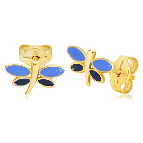 Náušnice ze žlutého 14K zlata - vážka s modrou glazurou na křídlech