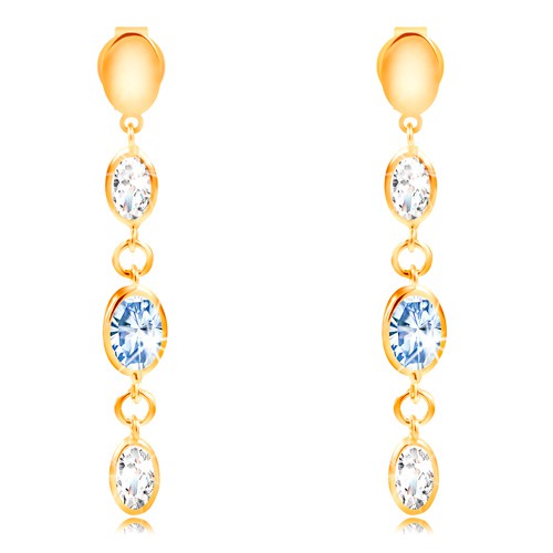 Popis produktu Náušnice ze žlutého 14K zlata - visící ovály, zirkony světle modré a čiré barvy