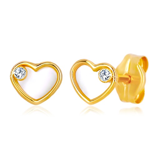Náušnice ze žlutého zlata 585 - srdce s přírodní perletí a zirkonem