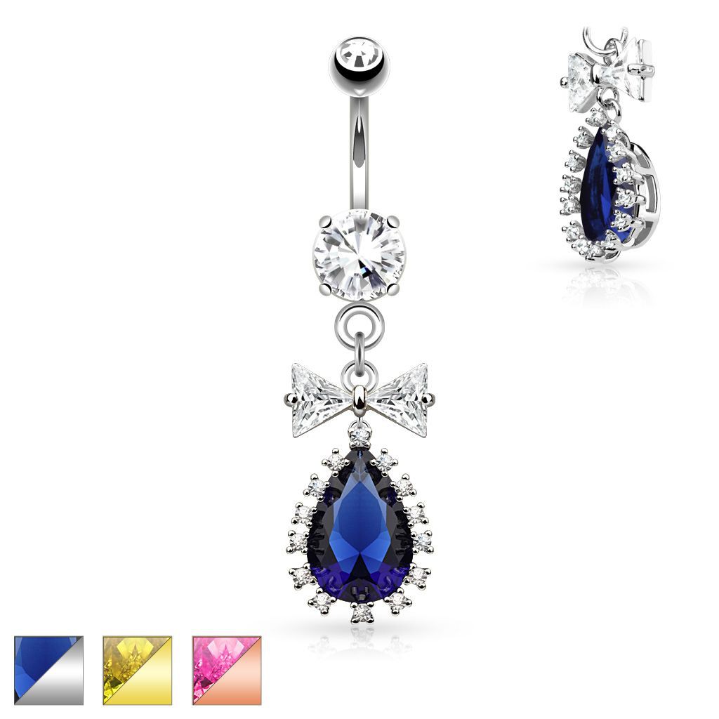 Piercing do bříška z oceli 316L, velká slza z broušeného barevného zirkonu lemovaná drobnými čirými zirkonky, mašlička.Nabízíme nejlepší poměr cena výkon. Zařaďte se mezi spokojené klienty.