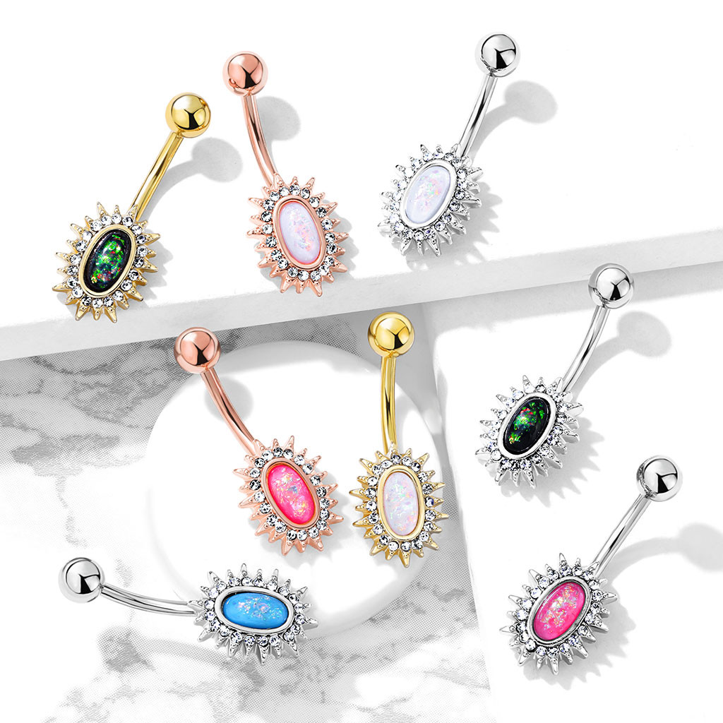 Popis produktu Ocelový piercing do pupíku - oválné sluníčko s barevným syntetickým opálem a krystaly, různé barvy - Barva piercing: Strieborná - zelená