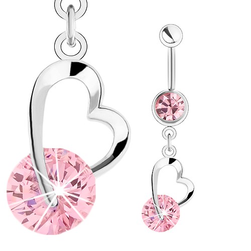 Popis produktu Ocelový piercing do pupíku, stříbrná barva, růžové zirkony, kontura srdíčka