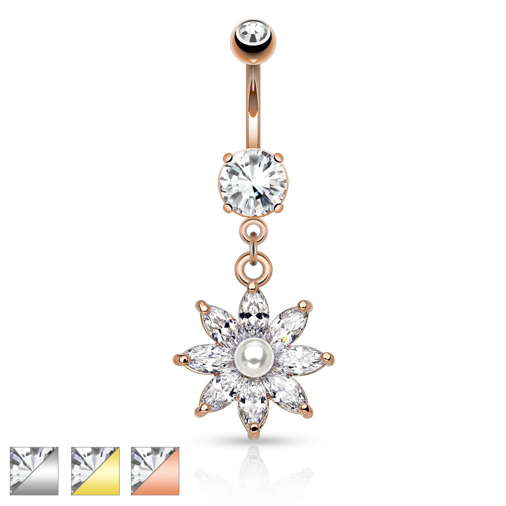 Popis produktu Ocelový piercing do pupíku, třpytivý zirkonový květ čiré barvy, perlička - Barva piercing: Stříbrná - čirá