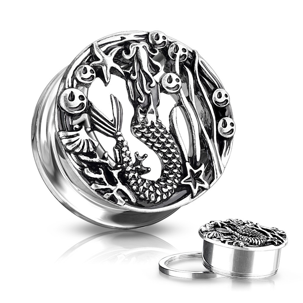 Plug z chirurgické oceli ve stříbrné barvě, mořská panna se zatočeným ocasem, hvězdice, řasy, mušle, patinovaný povrch. Upozorňujeme, že nabídka má omezenou platnost. Nakoupit a ještě ušetřit, co si víc přát.