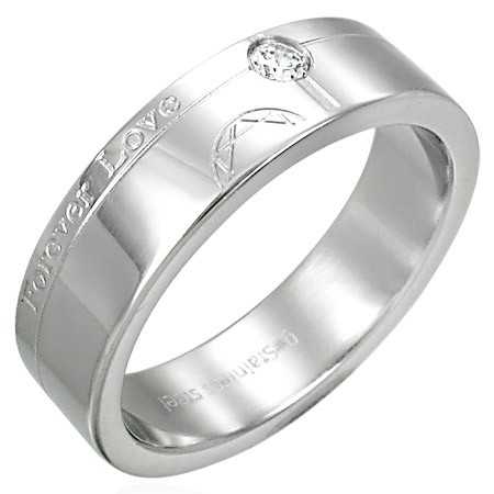 Lesklý ocelový prsten zdobený zirkonem, romantickým nápisem a gravírovanými geometrickými liniemi.V našem obchodě najdete nejvýhodnější ceny. Úspora a spokojenost z nákupu, záleží nám na vaší spokojenosti.