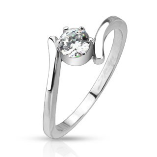 Popis produktu Ocelový prsten - ohnutá ramena držící okrouhlý čirý zirkon - Velikost: 57