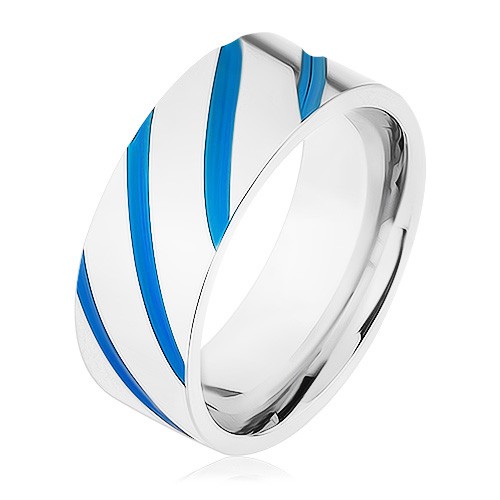 Ocelový prsten stříbrné barvy, diagonální pásy, modrá glazura - Velikost: 63