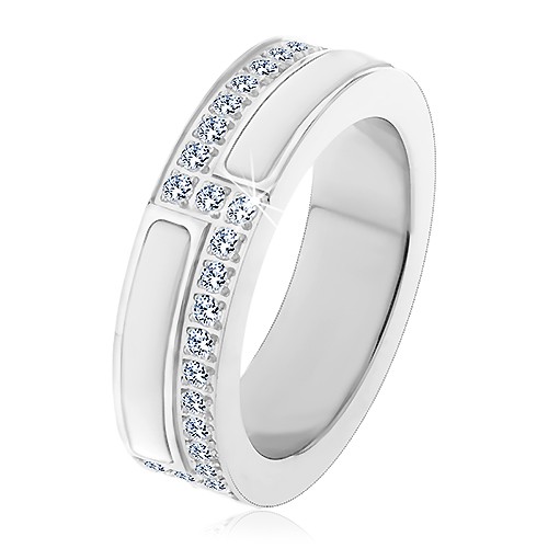Popis produktu Ocelový prsten stříbrné barvy, pásy z bílé keramiky a z čirých zirkonů - Velikost: 51