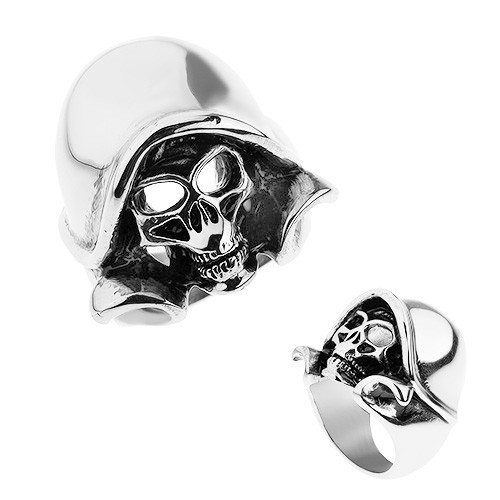 Popis produktu Ocelový prsten stříbrné barvy, patinovaná lebka s kapucí - Velikost: 59