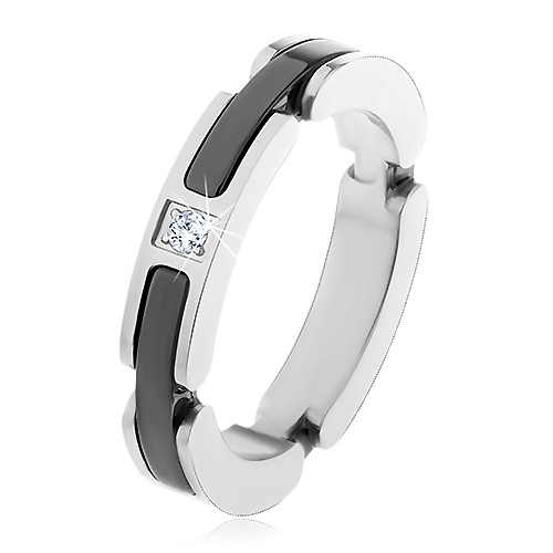 Prsten z oceli 316L ve stříbrném odstínu, úzké obdélníkové zářezy, lesklé pásy z černé keramiky a kulatý čirý zirkonek.Podívejte se také na další položky v našem katalogu. Jsme si jistí, že toto ocení nejeden zákazník.