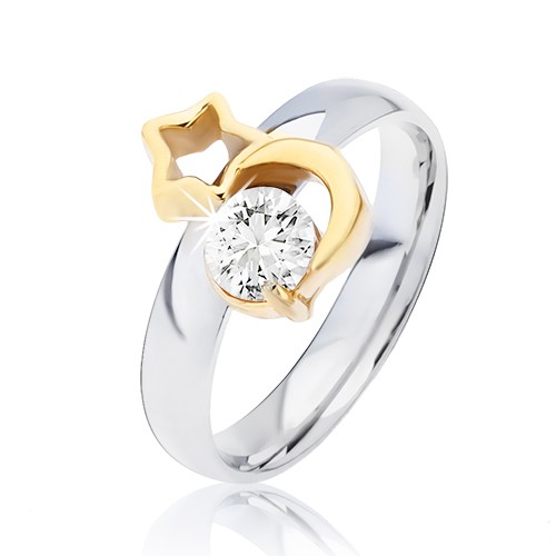 Ocelový prsten stříbrné barvy, zlatý měsíc, obrys hvězdy a čirý zirkon - Velikost: 58 od producenta Šperky Eshop - toto zboží si můžete nechat doručit s úžasnou cenovkou 111 CZK. Zboží zařazené v našem katalogu vás nezklame. Naplníte-li košík zbožím nad , dopravu až k vám domů máte ZDARMA. Naše heslo: kvalita, výhodná cena, prozákaznický přístup.