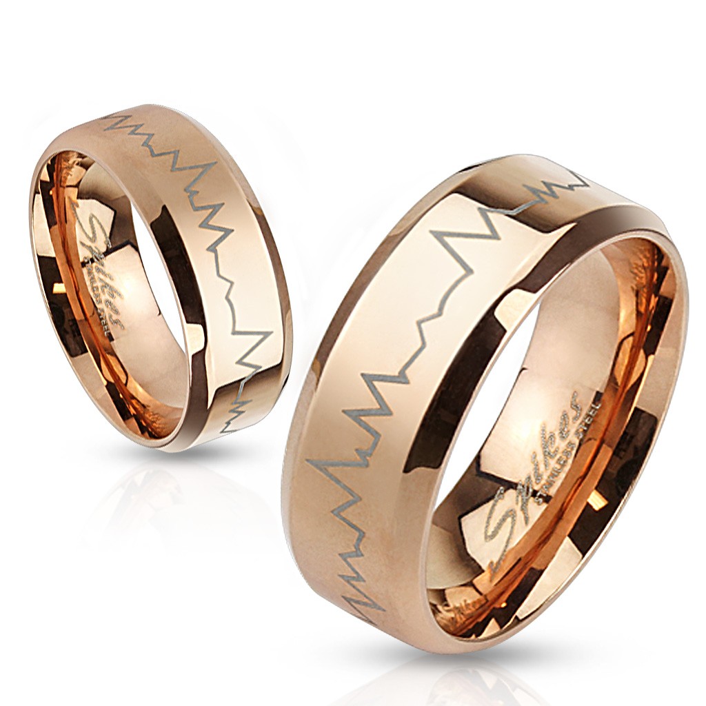Popis produktu Ocelový prsten v měděném odstínu - tlukot srdce, zkosené okraje, 8 mm - Velikost: 70