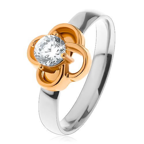 Popis produktu Ocelový prsten ve stříbrném odstínu, kvítek zlaté barvy s čirým zirkonem - Velikost: 52