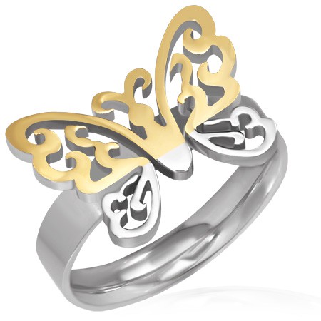 Popis produktu Ocelový prsten - vyřezávaný zlato-stříbrný motýl - Velikost: 52