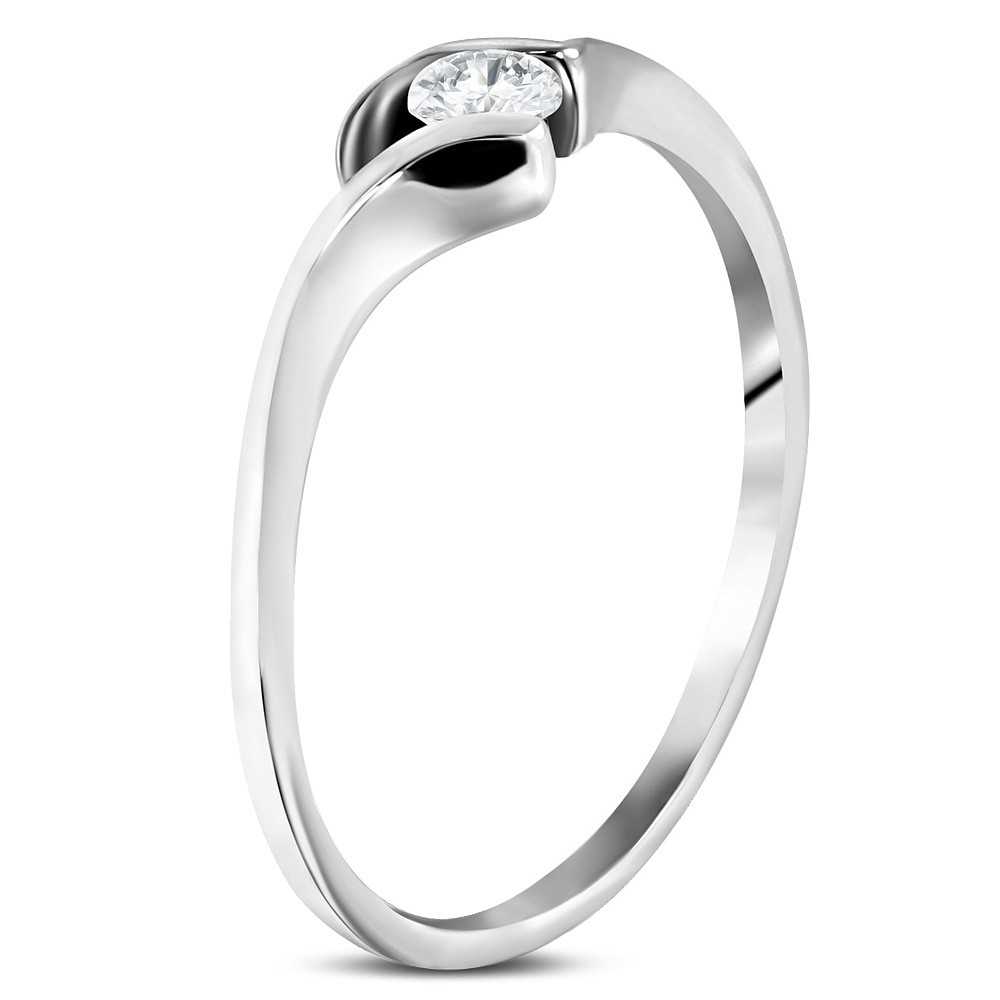 Popis produktu Ocelový zásnubní prsten - tenká zahnutá ramena, kulatý čirý zirkon - Velikost: 49