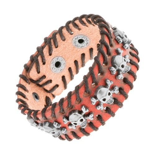 Popis produktu Oranžovohnědý kožený náramek, černá propletená šňůrka, lebky