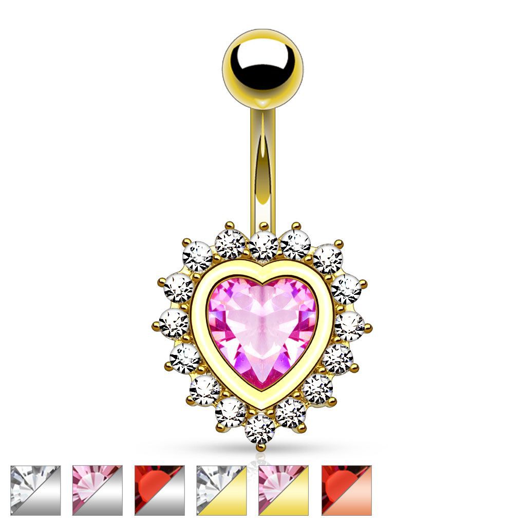 Popis produktu Piercing do bříška z chirurgické oceli, třpytivé zirkonové srdce s čirým lemem - Barva zirkonu: Růžová - P, Barva piercing: Zlatá