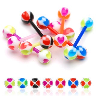 Popis produktu Piercing do jazyka - veselá kulička, barevná srdíčka - Barva piercing: Fialová - Růžová - AP