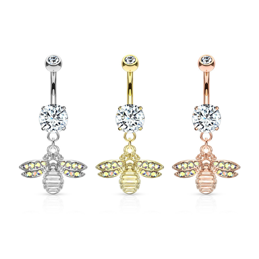 Piercing do pupíku s výraznějším čirým krystalem v kotlíku a přívěskem včely s křídly vykládanými krystaly v duhovém provedení.Naše výhodné nabídky čekají právě na vás. Vy neplatíte nic navíc!