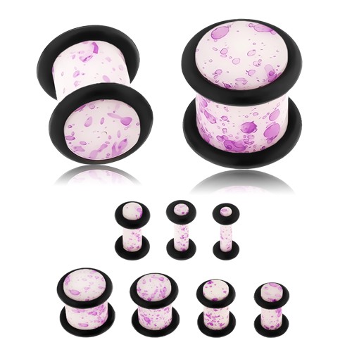 Plug do ucha, akryl, bílý povrch s fialovými skvrnami, černé gumičky - Tloušťka : 5 mm
