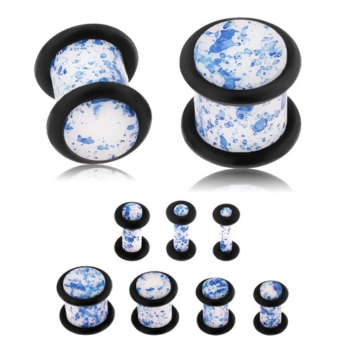 Levný a kvalitní produkt Plug do ucha z akrylu, bílý povrch potřísněný modrou barvou, gumičky - Tloušťka : 10 mm od společnosti výhodně za 51 CZK Kč. Zobrazit více »
