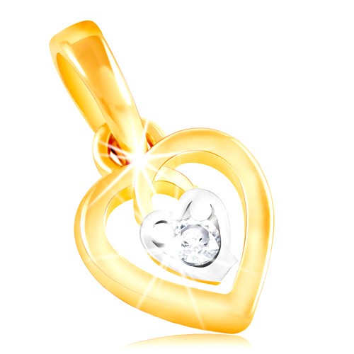 Popis produktu Přívěsek ze 14K zlata - kontura srdce a malé srdíčko s čirým zirkonem uprostřed