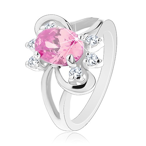 Popis produktu Prsten s broušeným oválným zirkonem v růžové barvě, lesklé obloučky - Velikost: 54