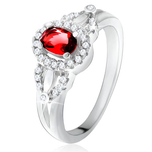 Popis produktu Prsten s červeným oválným kamenem, drobné čiré zirkonky, stříbro 925 - Velikost: 49