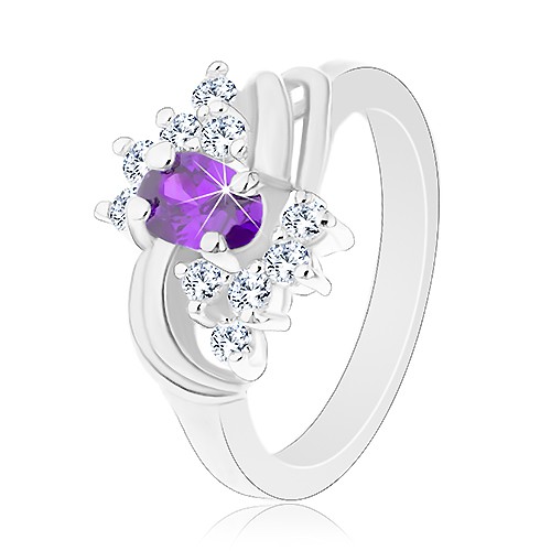Popis produktu Prsten s lesklými rameny, fialový ovál, hladké páry oblouků, čiré zirkony - Velikost: 52