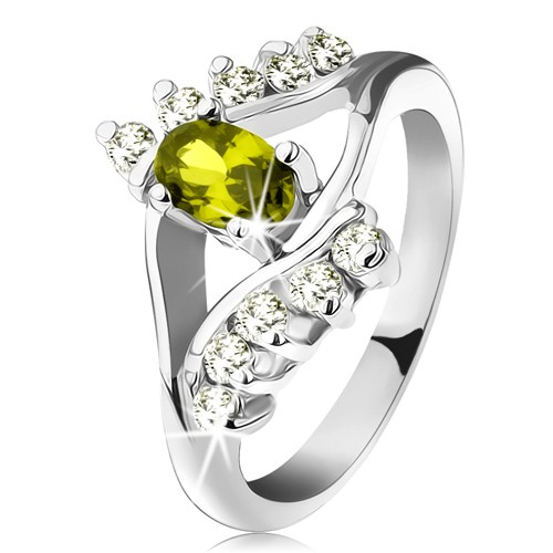 Prsten s úzkými rozdvojenými rameny ve stříbrné barvě, broušený zelený zirkonový ovál, řada pěti kulatých zirkonků.Upozorňujeme, že nabídka má omezenou platnost. Neplaťte jinde víc, než musíte.
