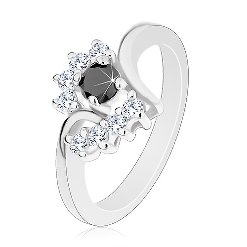 Prsten s lesklými rameny, stříbrný odstín, kulatý černý zirkon, čiré oblouky - Velikost: 48