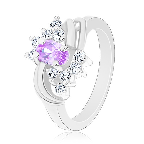 Popis produktu Prsten s lesklými rameny, světle fialový oválný zirkon, dva páry oblouků - Velikost: 56