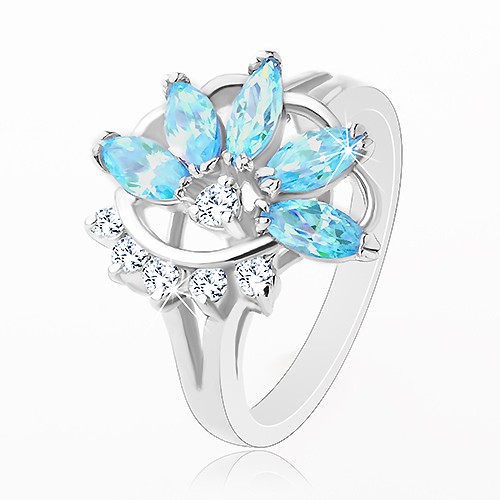 Popis produktu Prsten s lesklými rozdělenými rameny, modro-čirý poloviční květ - Velikost: 48