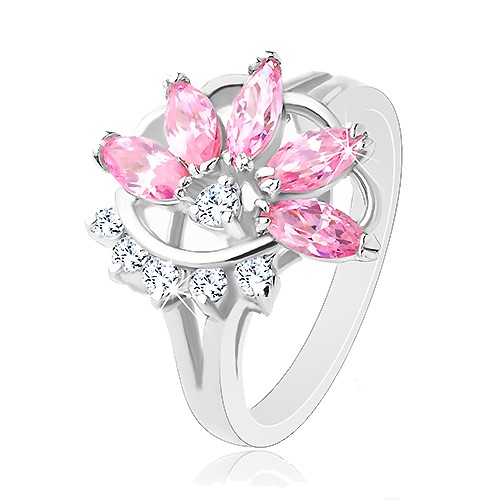 Popis produktu Prsten s lesklými rozdělenými rameny, růžovo-čirý poloviční květ - Velikost: 56