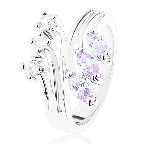 Popis produktu Prsten s lesklými rozvětvenými rameny, čiré a světle fialové zirkony - Velikost: 53