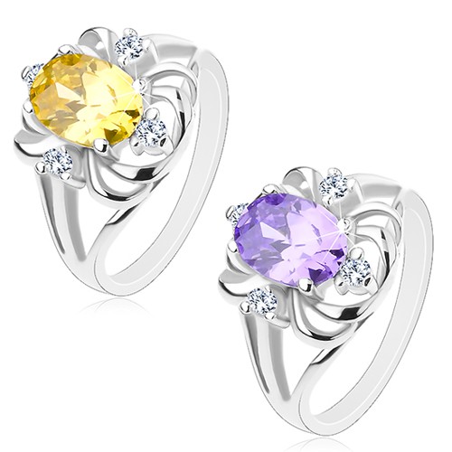 Popis produktu Prsten s lesklými rozvětvenými rameny, velký oválný zirkon, lesklé obloučky - Velikost: 49, Barva: Žluto-zelená