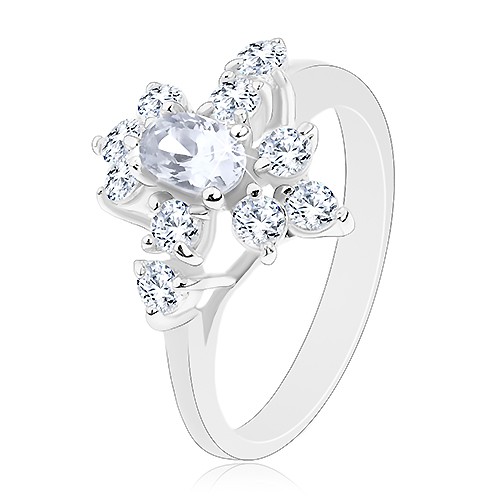 Popis produktu Prsten s lesklými zúženými rameny, čirý broušený ovál a kulaté zirkonky - Velikost: 50