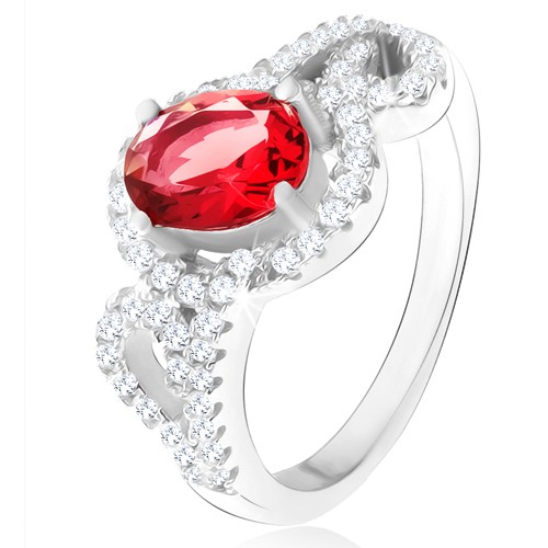 Popis produktu Prsten s oválným červeným zirkonem, poloviny obrysů srdcí, stříbro 925 - Velikost: 60