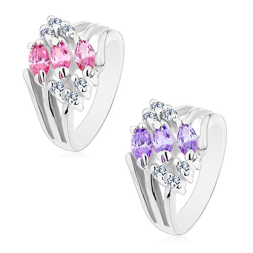Popis produktu Prsten s rozvětvenými rameny, zdobený čirými zirkony a barevnými zrnky - Velikost: 49, Barva: Růžová