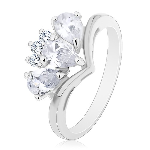 Popis produktu Prsten se zahnutými rameny, tři čiré zirkonové slzičky a kulaté zirkony - Velikost: 54
