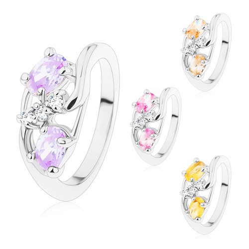 Popis produktu Prsten se zvlněnými rameny, velké barevné ovály, čiré zirkonky - Velikost: 54, Barva: Žlutá