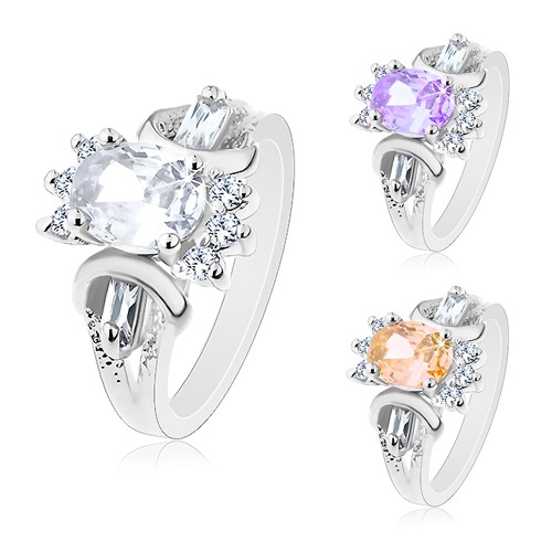 Popis produktu Prsten stříbrné barvy, broušený barevný ovál, kulaté a obdélníkové čiré zirkonky - Velikost: 53, Barva: Čirá