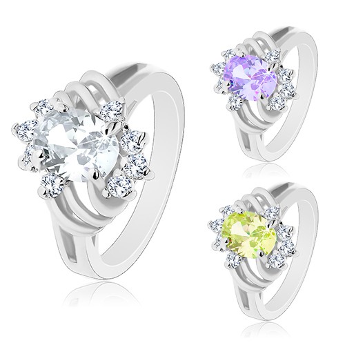 Popis produktu Prsten stříbrné barvy, broušený barevný ovál, tenké oblouky a čiré zirkony - Velikost: 53, Barva: Čirá