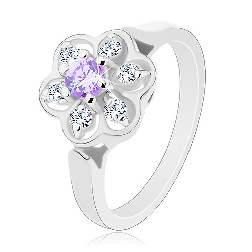 Popis produktu Prsten stříbrné barvy, čirý blýskavý kvítek se světle fialovým středem - Velikost: 52