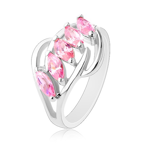 Popis produktu Prsten stříbrné barvy, lesklé obloučky, pás růžových broušených zrnek - Velikost: 50