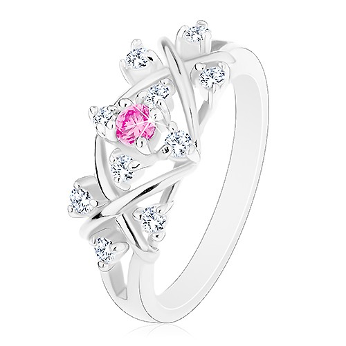 Prsten stříbrné barvy, lesklé překřížené linie, zirkony čiré a růžové barvy - Velikost: 59