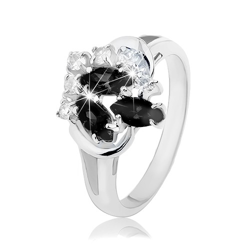 Popis produktu Prsten stříbrné barvy, rozdvojená ramena, černá zrnka, čiré kulaté zirkony - Velikost: 52
