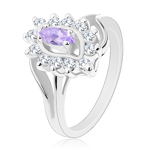 Prsten s rozdělenými rameny ve stříbrném odstínu, světle fialový zrnkovitý zirkon, kontura z čirých kulatých zirkonků.Nákup přes nás znamená jistotu dobré ceny. Naše heslo: kvalita, výhodná cena, prozákaznický přístup.