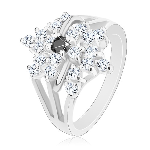 Prsten stříbrné barvy, rozvětvená ramena, čirý květ, černý zirkonek - Velikost: 53