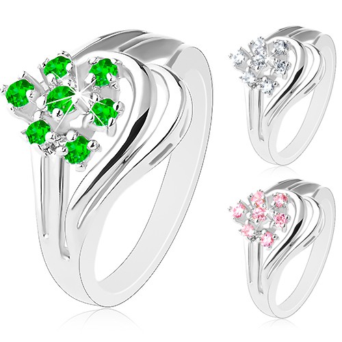 Popis produktu Prsten stříbrné barvy s rozvětvenými rameny, kulaté čiré zirkony - Velikost: 54, Barva: Čirá